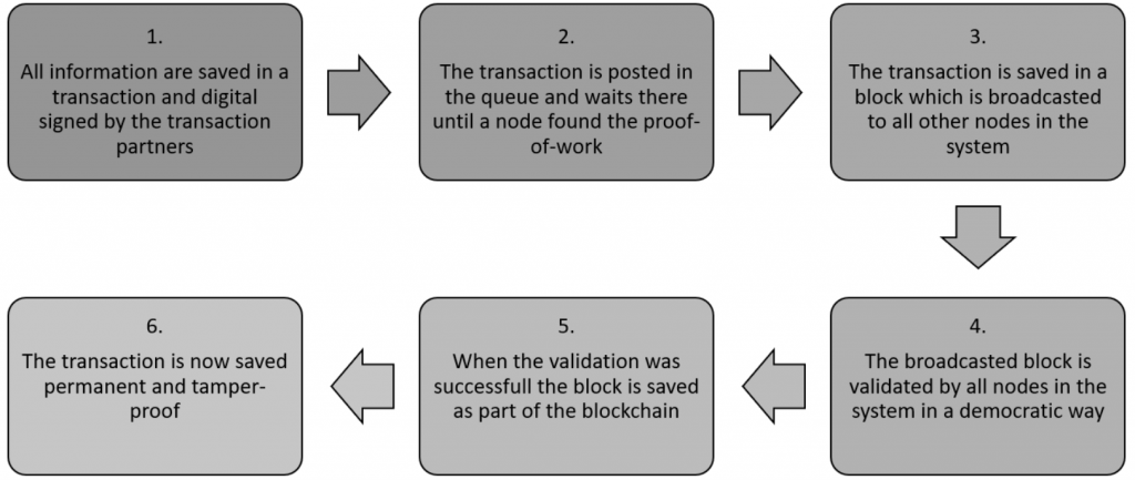 The procedure of posting a block into the blockchain starts with creating transaction data and broadcasting it to all nodes in the system (Figure 2-3). To prove that the node which initially created this transaction is authorized and to ensure that it is not manipulated, the transaction is provided with a digital signature.21 Therefore the content of the transaction is hashed and afterwards encrypted with the private key of the owner.